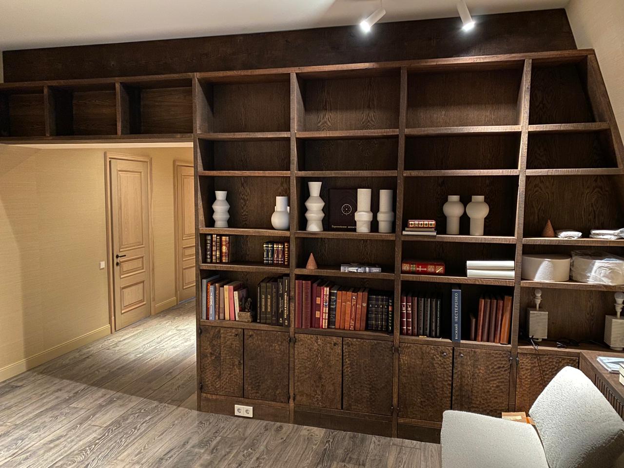 - Библиотека: стеллаж, декоративная облицовка радиатора (материал: массив дуба, МДФ фанерованный шпоном дуба, фурнитура собственного производства, декоративная резьба «запил», фасады декоративная резьба «под стамеску», обработка дерева маслом)