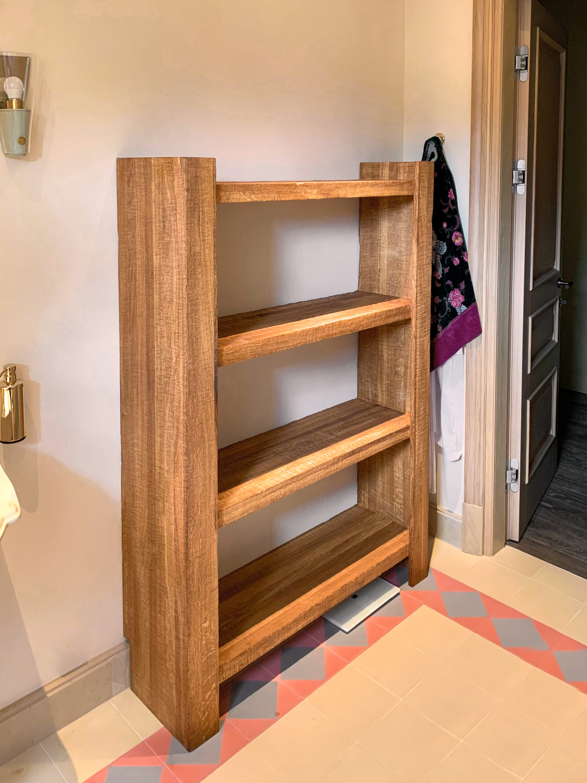 - Стеллаж в ванную комнату (материал: массив дуба, декоративная резьба «запил», обработка дерева маслом)