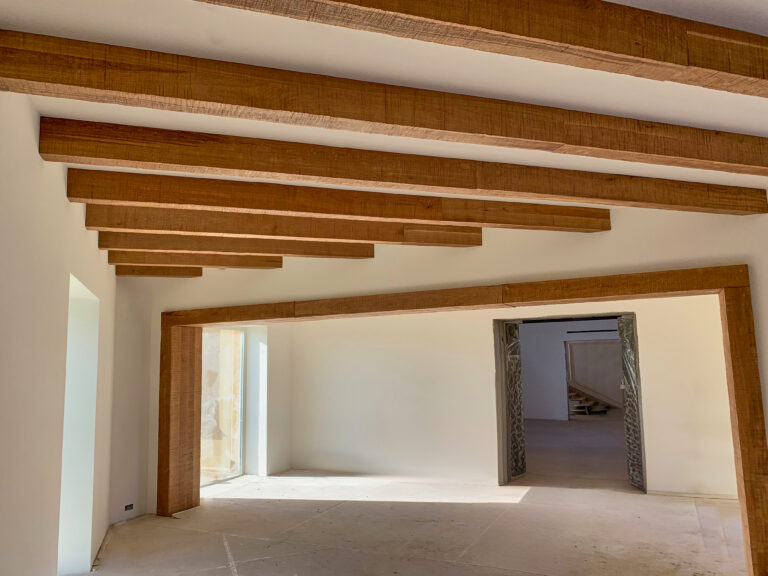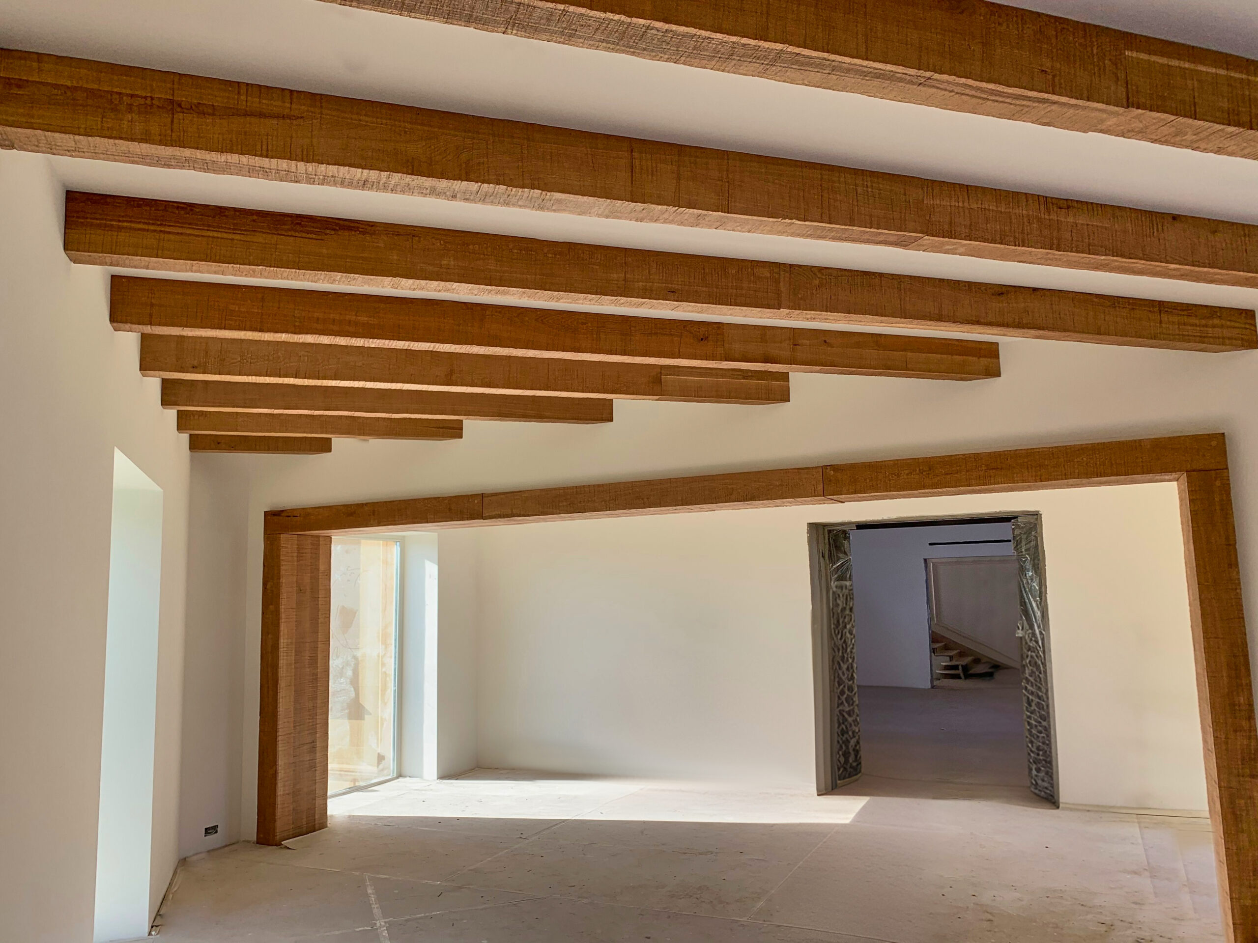 - Потолочные балки и портал (материал: массив дуба, декоративная резьба «запил», обработка дерева маслом)