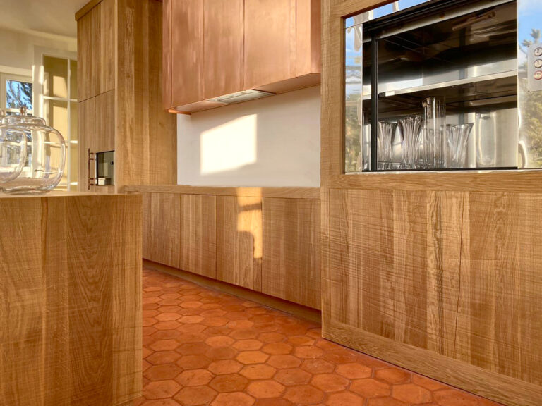 - Кухня (материал: массив дуба, МДФ фанерованный шпоном дуба, фурнитура собственного производства – ручки, фурнитура blum – петли и направляющие, декоративная резьба «запил», медный сатинированный купол под вытяжку, обработка дерева маслом)