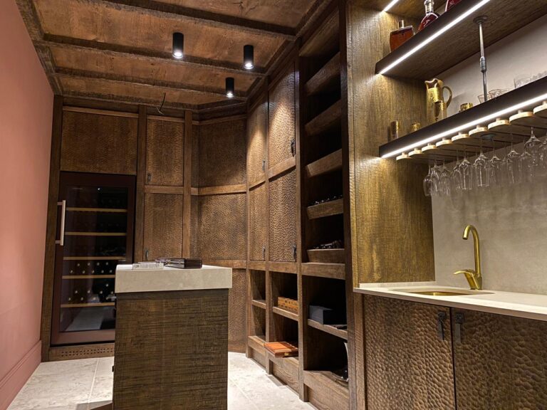 - Винная комната: потолок, шкафы (материал: массив дуба, МДФ фанерованный шпоном дуба, фурнитура собственного производства, декоративная резьба «запил», фасады декоративная резьба «под стамеску», обработка дерева маслом)