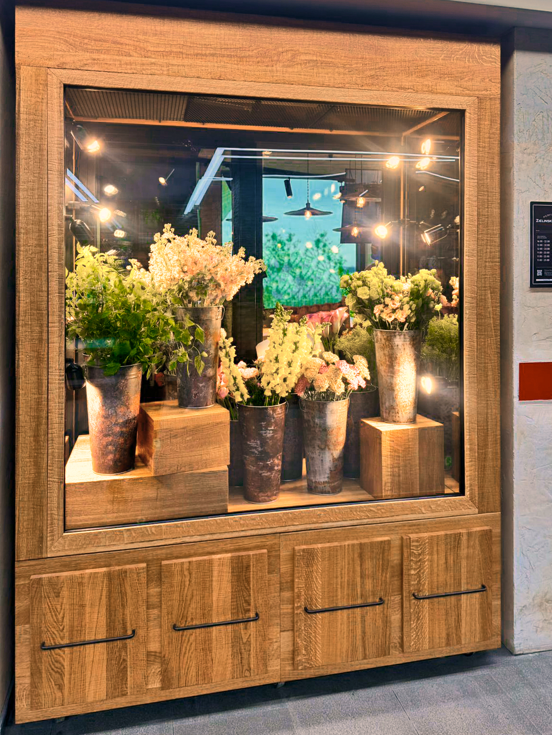 - Специально для магазина цветов разработан и произведён холодильник из массива дуба.
